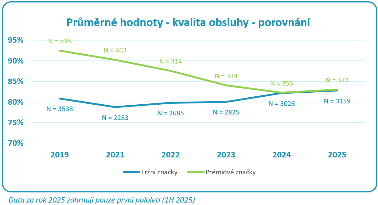 Prémiové vozy si většina lidí spojuje s kvalitním zpracování, nejmodernějšími technologiemi, luxusními materiály a také s očekáváním, že stejně prémiová bude i samotná zákaznická zkušenost. Realita posledních let ale ukazuje, že tahle rovnice není vůbec tak jednoznačná, jak by se mohlo zdát. Zatímco v roce 2019 byl rozdíl mezi tržními a prémiovými značkami patrný na první pohled – nejen v samotném voze, ale i v přístupu prodejců – dnes se tyto světy začínají přibližovat. Trendy od roku 2021 ukazují, že tržní značky postupně zlepšují kvalitu obsluhy a stávají se aktivnějšími při komunikaci se zákazníky, zatímco prémiové značky zaznamenaly mírný pokles v některých oblastech, jako je individuální přístup prodejců či následný kontakt po návštěvě showroomu.